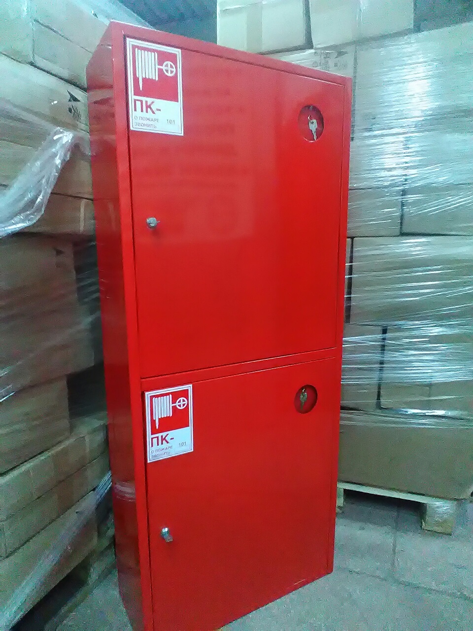 оснащен двумя корзинами для пожарного рукава, врезной замок и место для хранения ключа, оснащенное сдвижным стеклом или евроручку, четырьмя заглушенными отверстиями для подвода ПК, наклейкой "ПК".