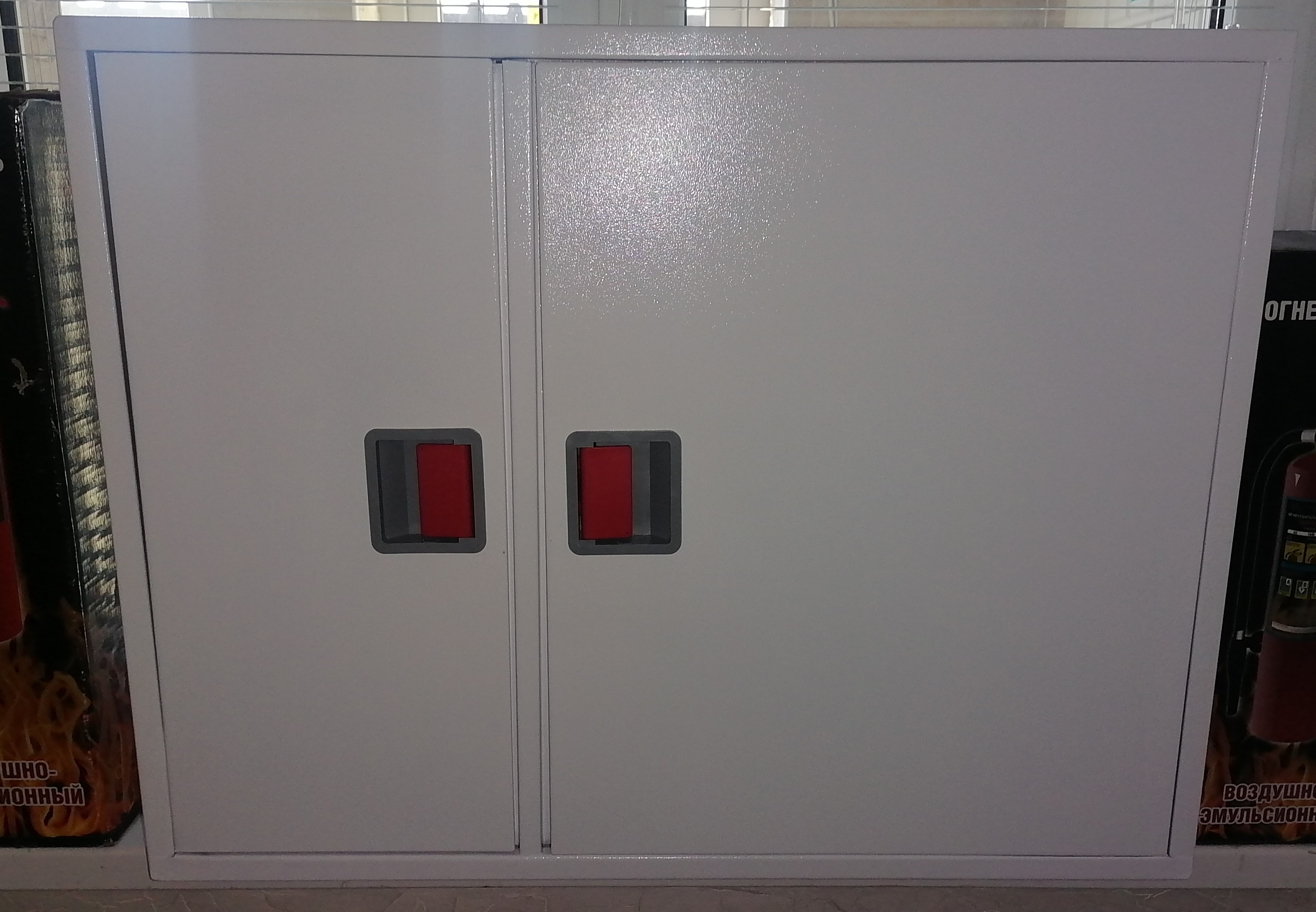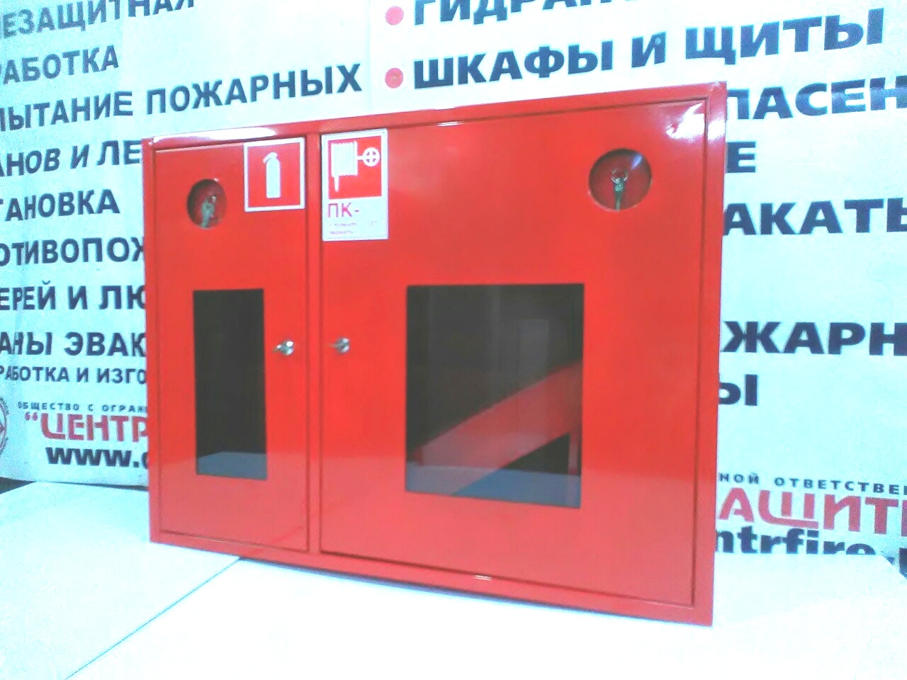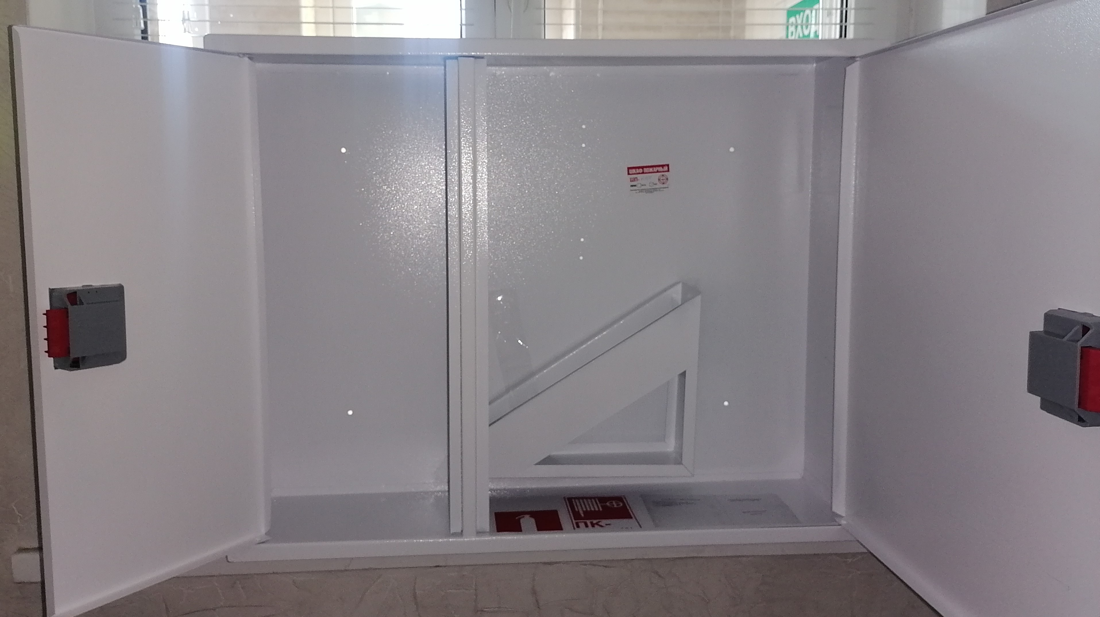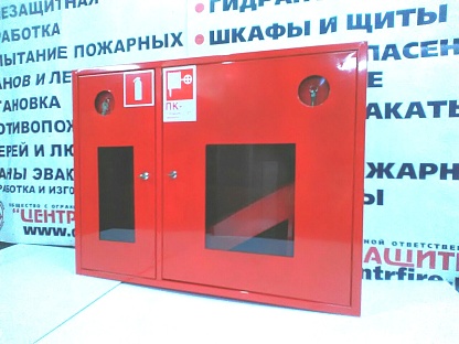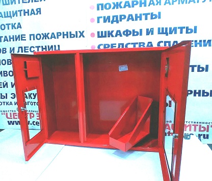оснащен корзиной для пожарного рукава, врезной замок и место для хранения ключа, оснащенное сдвижным стеклом или евроручку, двумя заглушенными отверстиями для подвода ПК, наклейкой "ПК и огнетушитель".