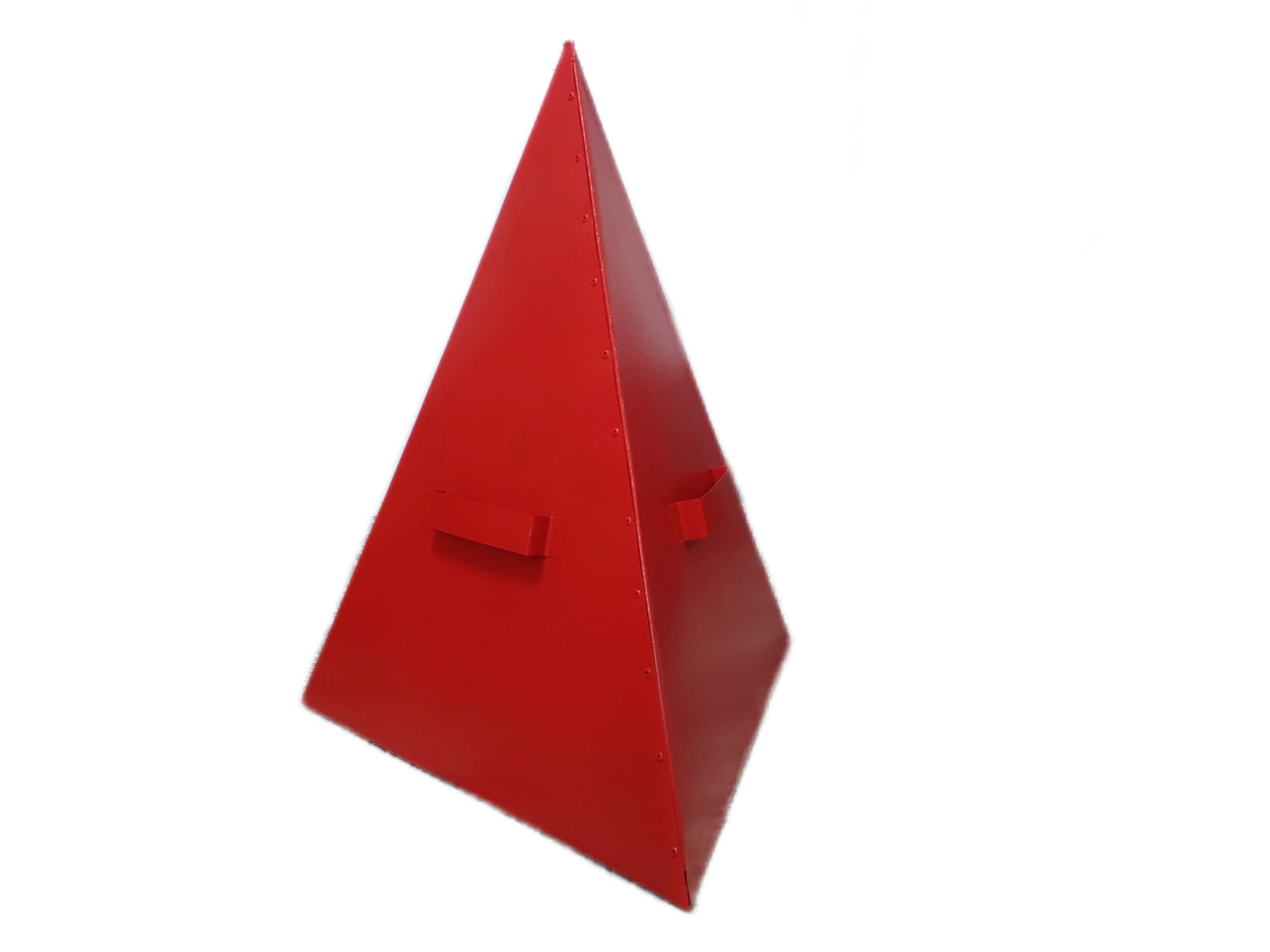 Пожарная пирамида для пожарного гидранта 500x500x600 или Пирамида ГП (гидрант пожарный) предназначена для, ограждения, обнаружения и защиты пожарных гидрантов. Она используется при проведении ремонтных и технических работ. Пирамида выглядит как трехгранный конус с ручками на боковой части. Ручки предназначены для удобства перемещения Пирамиды. Изготавливается Пирамида из листового металла, толщиной не менее 0,6 мм и обязательно окрашивается порошковой краской RAL, красного цвета. Что обеспечивает продолжительность службы в различных погодных условиях. Большинство противопожарного оборудования окрашиваются в красный цвет, так как этот цвет ассоциируется у человека с опасностью, вызывает внимание. Предметы красного цвета бросаются в глаза в первую очередь.